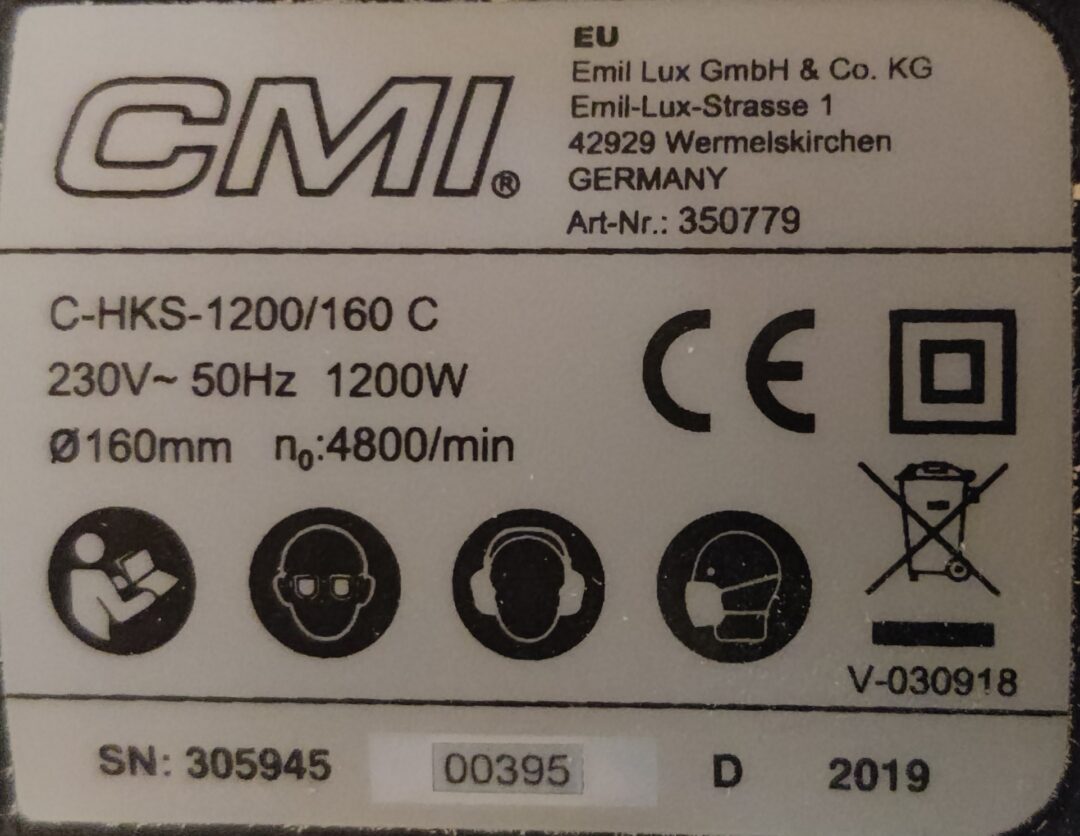 Käsisirkkeli: CMI C-HKS-1200/160 C By user176176 • 22.10.2025 CMI C-HKS-1200/160 C 1200W Halkaisija: 160mm Kierrosnopeus 4800/min